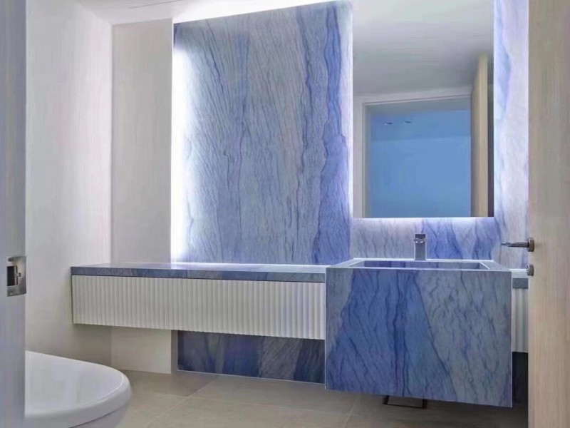 The appearance of Azul Macaubas quartzite countertops is both striking and versatile. The deep blue background provides a serene, elegant base, while golden veins flow naturally, creating movement and depth. Polished surfaces enhance light reflection, ideal for kitchen countertops and bathroom vanities, while honed finishes offer a soft, tactile surface suitable for flooring and commercial areas. Each slab’s unique veining and color variations make it ideal for designers seeking personalized aesthetics in azul macaubas fantasy quartzite projects.