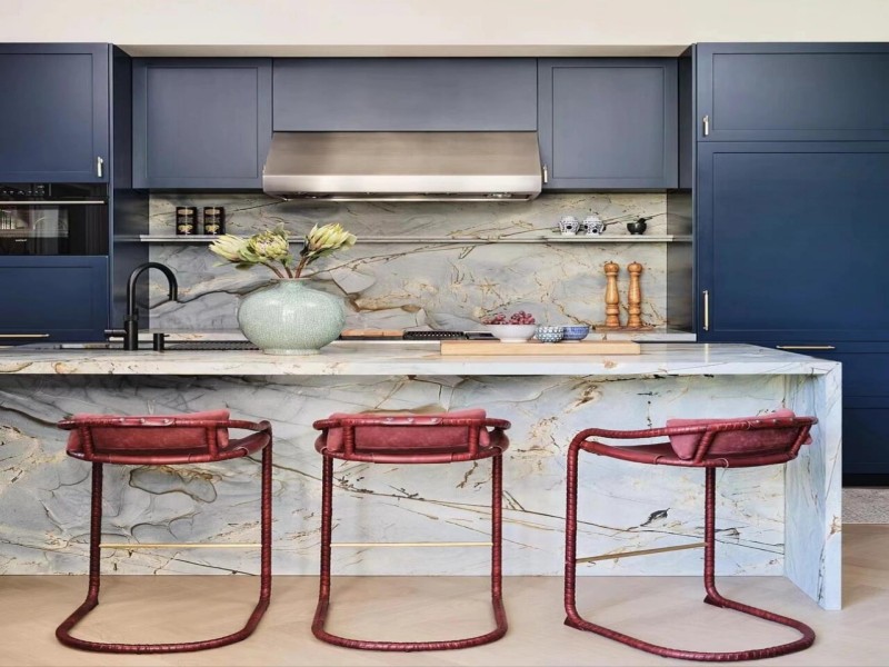 Blue Roma Quartzite is commonly used for kitchen countertops, islands, backsplashes, and bar countertops. Its durability and elegance make it a standout feature in any space, elevating the overall look of the kitchen. The stone's dynamic veining patterns create a visually appealing contrast with cabinetry and appliances.