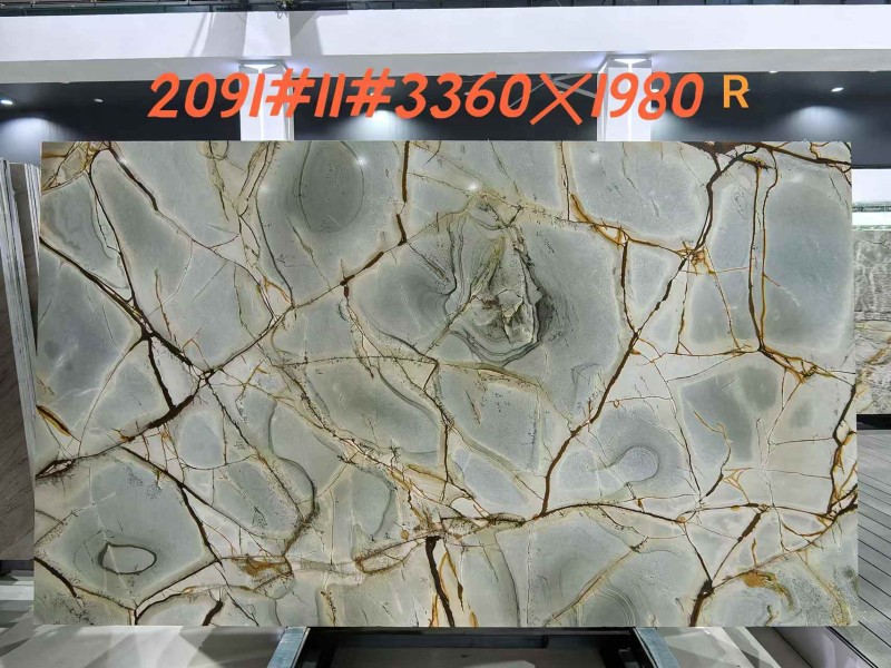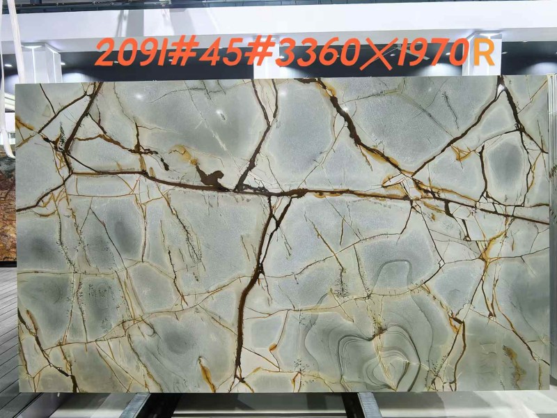 Blue Roma Quartzite is a metamorphic rock formed from sandstone under intense heat and pressure. The unique process of its formation results in a stone that is exceptionally hard and resilient, making it a highly sought-after material for countertops, floors, walls, and other architectural features. The light blue base, complemented by the bold golden brown streaks, creates a dynamic visual effect, making each slab of Blue Roma Quartzite a true work of art.