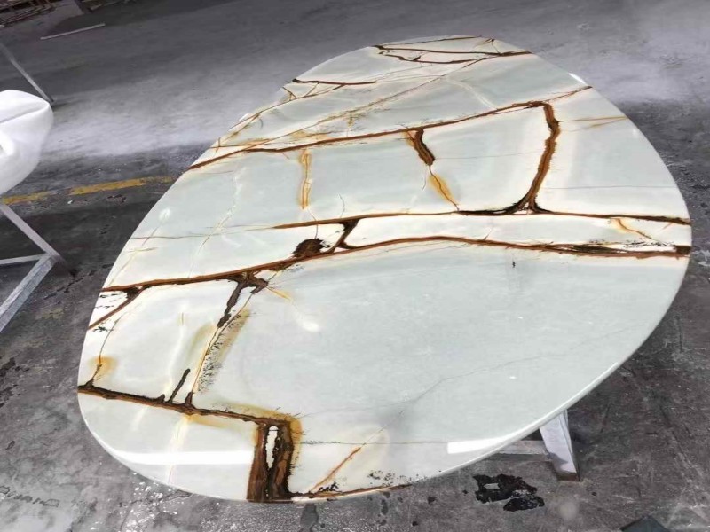 Blue Roma Quartzite is a natural stone with a light blue background and rich golden brown veins, known for its durability and aesthetic appeal. It is a popular choice for high-end kitchen countertops due to its versatility in various kitchen applications.