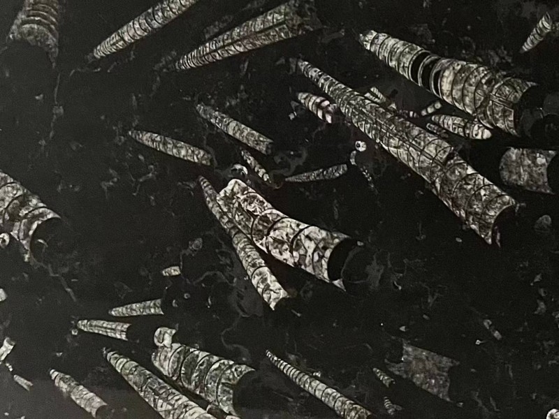 strong contrast between dark background and fossil textures