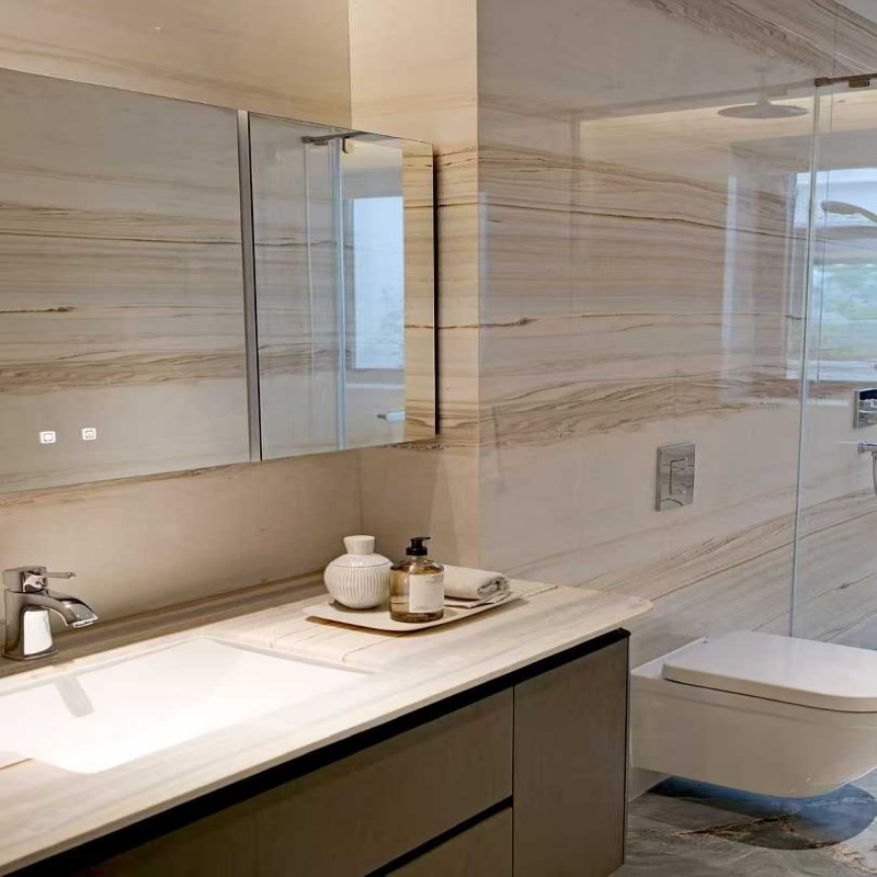 Palissandro White Marble Slab, which may be used for vanity counters, bathtubs, shower walls and flooring, can make any bathroom feel like a magnificent spa getaway. Its water-resistant characteristics and low porosity make it perfect for use in moist environments.