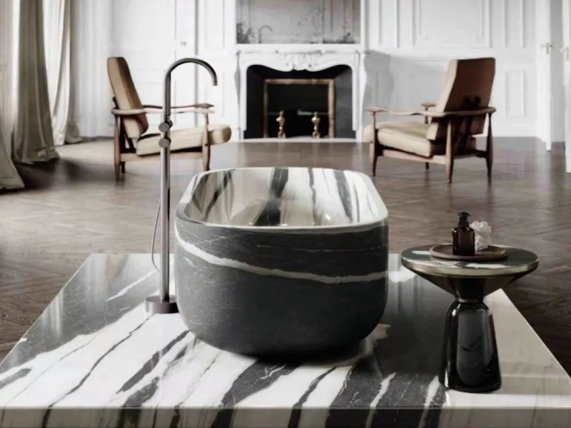 This marble’s sleek white background with dark veins makes it an excellent option for bathroom vanities. Whether used for countertops or sinks, it can elevate the space by providing a luxurious, spa-like atmosphere. Its resistance to moisture and stains also makes it practical for bathroom use.